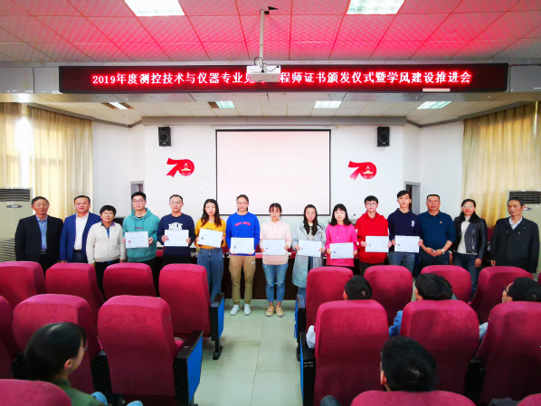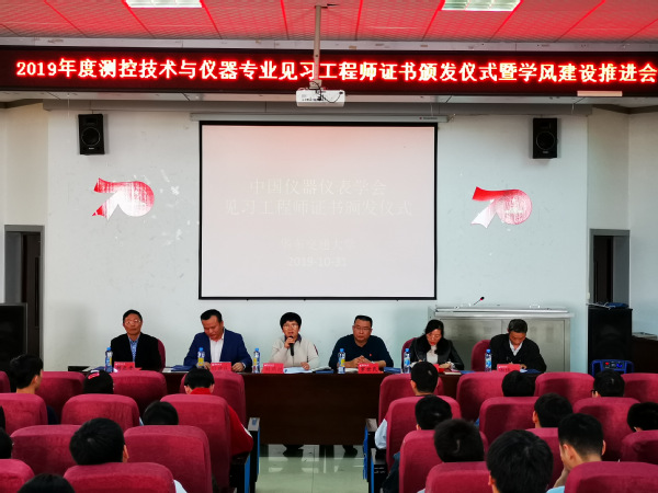 10月31日下午,机电学院于教13栋报告厅举办2019年度测控技术与仪器专业见习工程师证书颁发仪式暨学风建设推进会。教务处副处长罗世民、院长刘燕德、常务副院长周建民、党委委员金晶、测控技术与仪器专业工程教育认证负责人刘正平、测控技术与仪器专业教师、相关辅导员及学生参加会议。