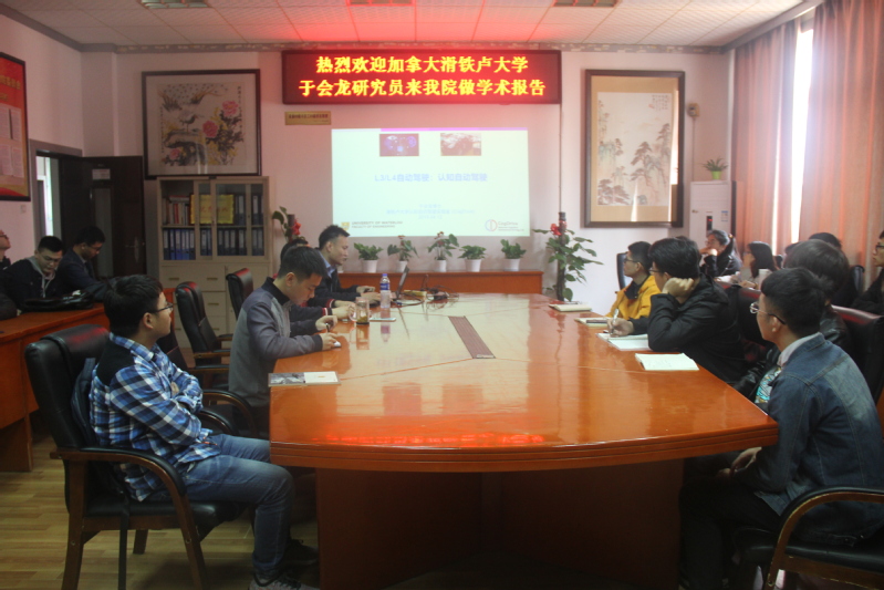 于会龙介绍了自己所在实验室的基本情况,从无人驾驶的诞生、发展及现阶段存在的主要问题等方面与全体老师、学生展开讨论。他表示无人驾驶是近几年甚至将来很长一段时间的国内外研究热点,需要大量工业界与学术界的资源投入,具有很好的前景。他勉励在座学生积极研究,努力探索,用自己的真才实学推动无人驾驶技术的发展。