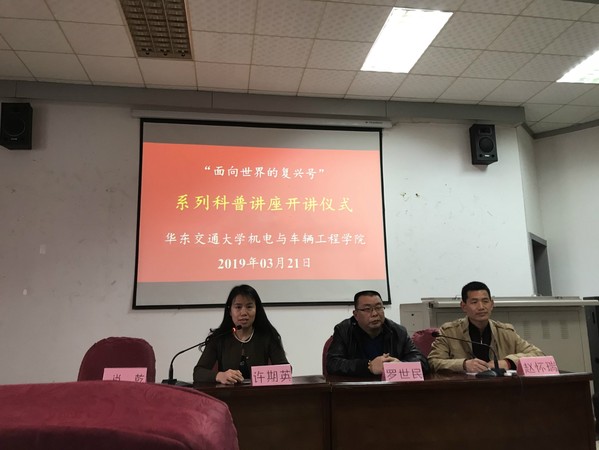 3月21日下午,yl23455永利集团主办的“面向世界的复兴号”系列科普讲座在教13栋学术报告厅举行开讲仪式。同时,邀请了学校教务处副处长罗世民副教授作为第一讲的主讲嘉宾。南昌石人教育科技有限公司总经理赵怀瑞博士应邀出席,轨道车辆系主任许期英副教授担任主持。