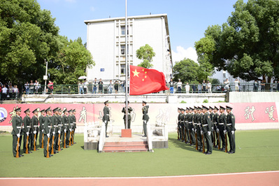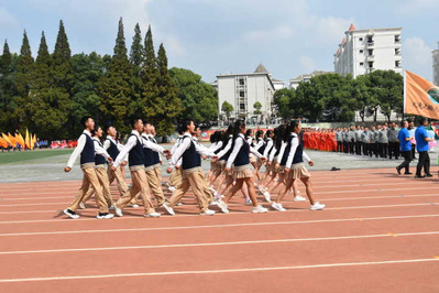 伴着高亢嘹亮的《运动员进行曲》,国旗队、校旗队、彩旗队、各学院师生代表队及机关、后勤方阵队有序入场。他们朝气蓬勃,意气风发,身着统一服装,口号响亮,步伐坚定,昂首挺胸地走向主席台,充分展示“思想再解放,改革再出发”的坚定信心和昂扬斗志。《义勇军进行曲》回荡在运动场上空,庄严而神圣,五星红旗迎风飘扬,鲜艳又夺目。