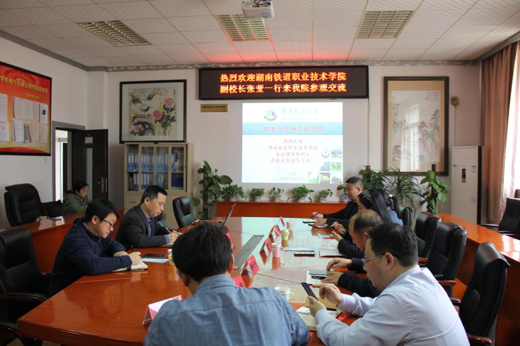 4月13日下午,湖南铁道职业技术学院副校长张莹一行5人赴我院考察交流,院长肖乾、院长助理张龙出席本次会议。