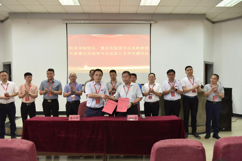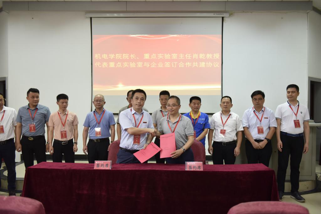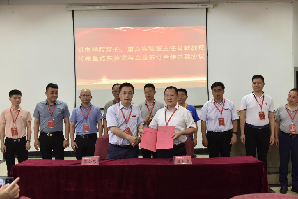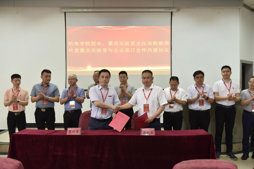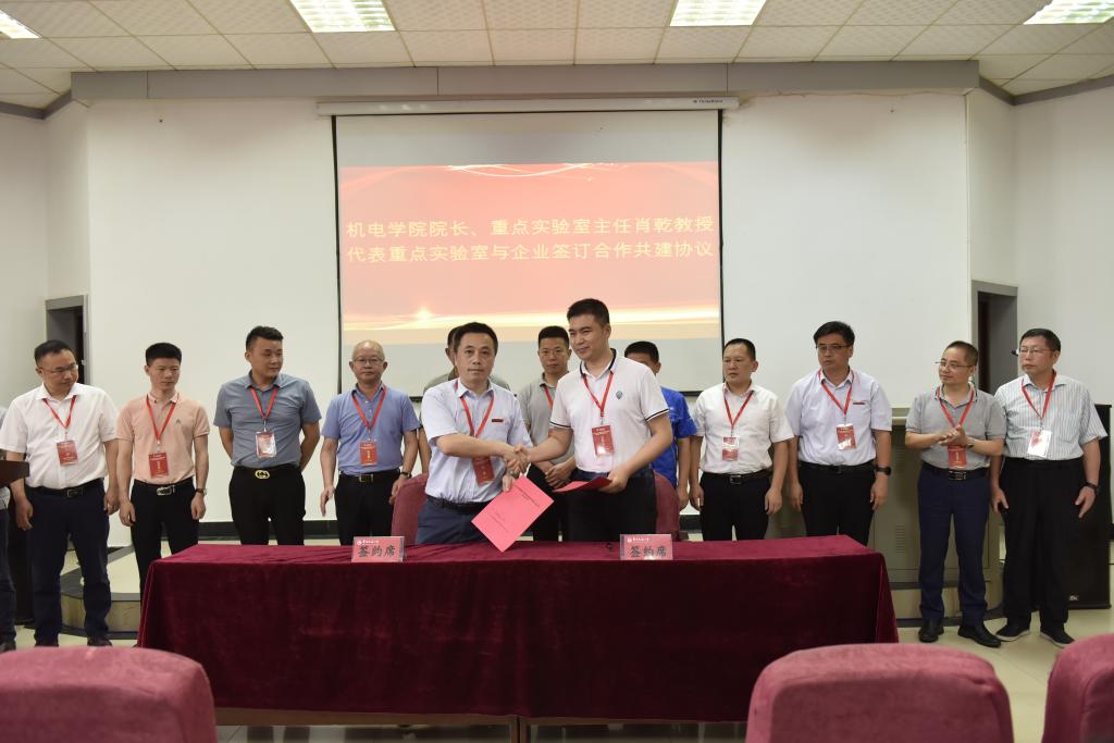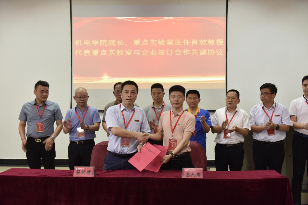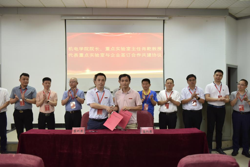 机电学院院长、重点实验室主任肖乾教授代表重点实验室,分别与江西江铃集团新能源汽车有限公司、株洲国创轨道科技有限公司、山东汉格威新能源汽车电控制造有限公司、江西华伍制动器股份有限公司、江西省投资集团有限公司、江西南行投资控股有限公司、江西纵横特种设备有限公司、扬州市华胜机电制造有限公司、深圳市蔚蓝智能视觉技术有限公司9家企业签订合作共建协议。