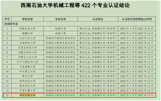 6月25日,中国工程教育专业认证协会官网上发布了《关于公布西南石油大学机械工程等422个专业认证结论的通知》,公布了2021年度全国工程教育专业认证的认证结论。我院机械设计制造及其自动化专业通过工程教育认证,认证有效期6年(2022年1月至2027年12月)。