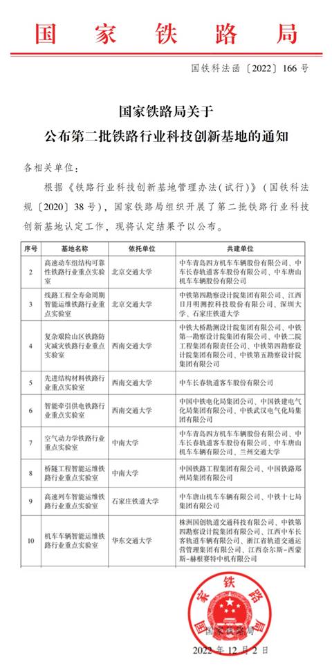 近日,国家铁路局发布了《关于公布第二批铁路行业科技创新基地的通知》(国铁科法函〔2022〕166号),我校机电学院牵头的“机车车辆智能运维铁路行业重点实验室”入选“国家铁路局第二批铁路行业科技创新基地”,获批“铁路行业重点实验室”,此次共有北京交通大学等7所高校入选,我校为省内唯一。