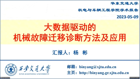 2023年5月9日下午,西安交通大学助理教授杨彬博士主讲《大数据驱动的机械故障迁移诊断方法及应用》学术讲座。讲座由yl23455永利集团副院长张龙教授主持,学院和实验室研究团队师生100余人通过线上方式参加。