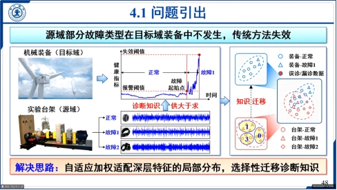 杨彬博士围绕大数据下机械故障智能诊断面临的关键难题,系统性地介绍了“数模一体,协同适配”的迁移诊断方法。重点阐述了考虑特征联合分布差异的可迁移性度量、基于小样本指向性的靶向迁移诊断、机械故障局部迁移诊断,并介绍了所在研究团队近年来如何利用智能诊断、迁移诊断等前沿理论与方法,解决大规模轴承加工质量监测与缺陷识别的企业实际问题。最后杨彬博士对迁移智能诊断研究及应用过程中仍需攻关的难点进行了总结与展望。