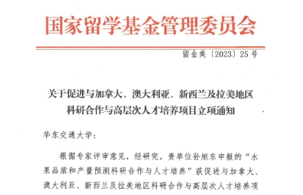 近日,教育部国家留学基金委公布“促进与加拿大、澳大利亚、新西兰及拉美地区科研合作与高层次人才培养项目”立项结果,由我院智能载运工具与动力控制中心团队孙旭东申报的《水果品质和产量预测科研合作与人才培养》项目成功获批,全国仅立项25个。