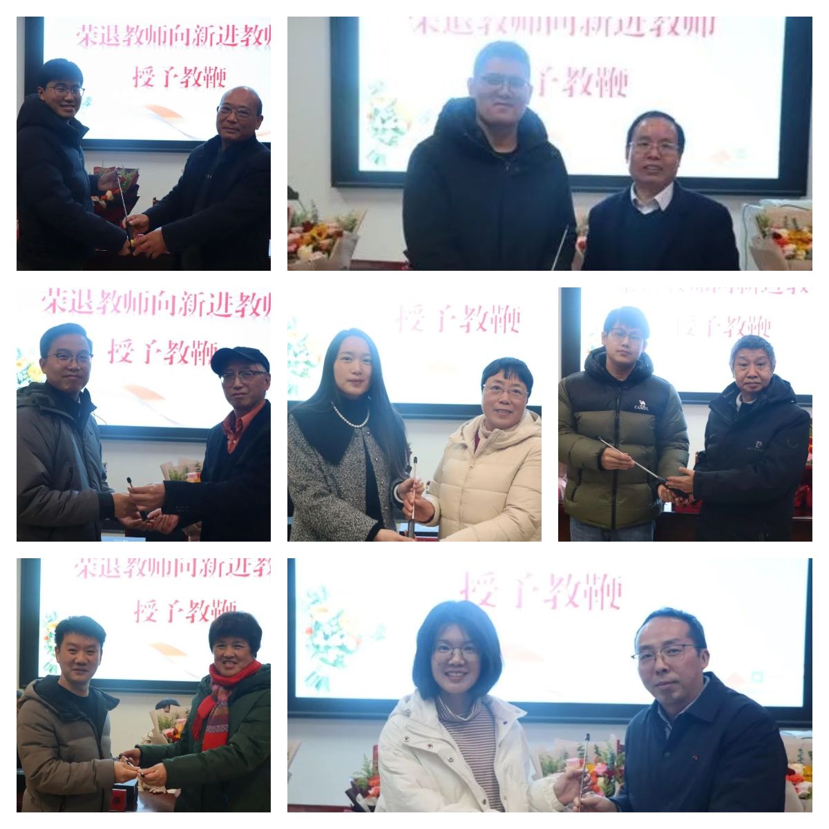 荣退活动结束后,紧接着对新进7位教师刘家阳、徐聪聪、彭玲、许慧琴、余九、杨丰源、昌超进行传新启航仪式。仪式特意安排了教鞭传承环节,新进青年教师代表从荣休教师手中接过象征着荣誉和责任的“教鞭”。他们纷纷表示,将坚守立德树人根本任务,跑好接力棒,用实际行动弘扬和践行教育家精神。