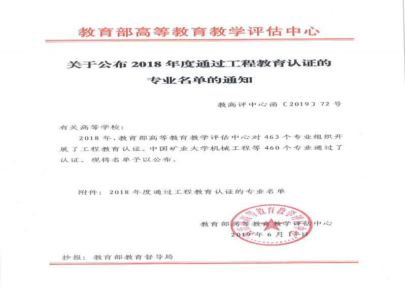 2019年6月13日,教育部高等教育教学评估中心发布了《关于公布2018年度通过工程教育认证的专业名单的通知》(教高评中心函〔2019〕72号)文,我院测控技术与仪器专业顺利通过了中国工程教育专业认证。