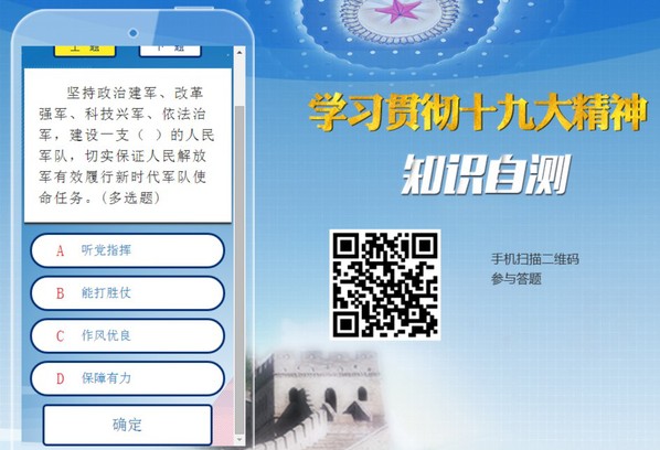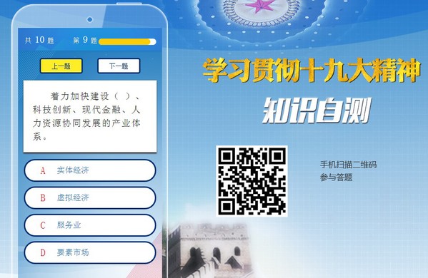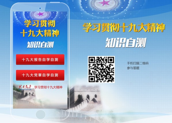 网友可登录共产党员网首页,进入“学习贯彻党的十九大精神知识自测”专区进行答题,或者通过手机扫描二维码参与答题。