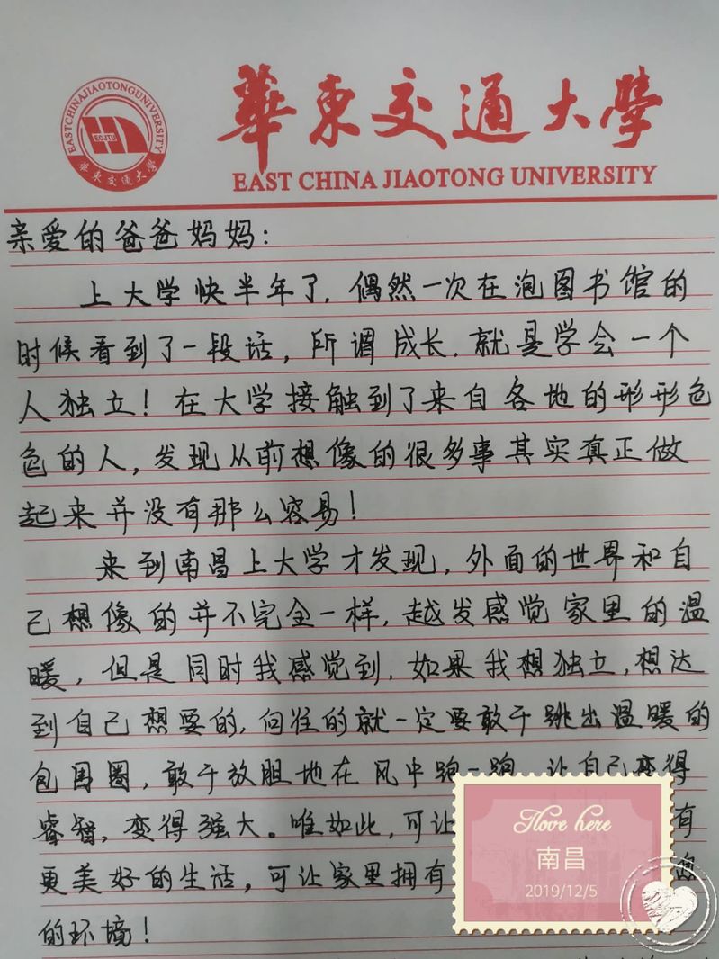 一字一句的感激与祝福从笔尖流露,一声声思念的问候在信纸跳跃。家书是亲人之间沟通的桥梁,是中华传统文化的重要载体。举办“家书礼”就是希望在网络通信的快速发展的今天,用传统家书的传承中国传统文化中“孝”文化的本质。在将家书收齐后,机电学院将选择“驿寄梅花、鱼传尺素”这一古老却充满温情色彩的方式,将承载着对父母感恩之情的书信寄往了祖国的大江南北。