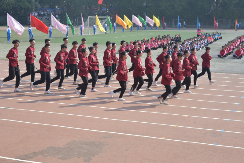 伴随着高昂的《运动员进行曲》,国旗队,校旗队,彩旗队,各学院师生代表队及机关、后勤方阵队有序入场,他们着装统一,口号响亮,意气风发,蓬勃向上,迈着坚定的步伐,昂首挺胸地从主席台前走过。“机电巨龙,气势如虹,劈波斩浪,力压群雄。”嘹亮大气的口号体现出了机电学子们的坚定信心和昂扬斗志。在庄严而神圣的国歌声中,五星红旗冉冉升起,在风中飘扬,鲜艳夺目。