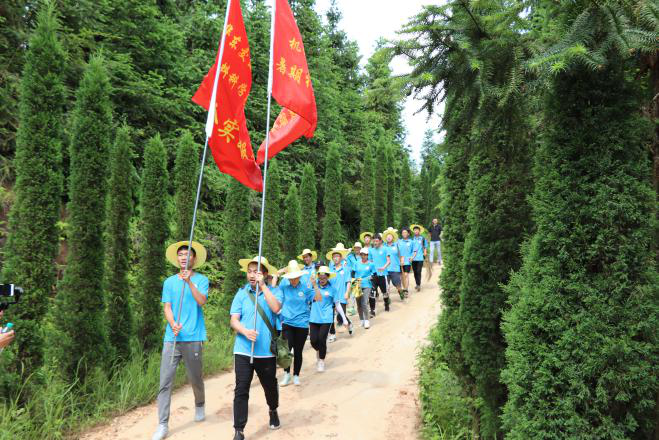 当时只记入山深,青溪几度到云林。当日正值小暑时节,实践团的成员们都头顶麦色草帽,步伐统一,行走于山间自然。他们情绪高涨,在队长胡宇江的带动下,拉歌声不时响起,《团结就是力量》、《歌唱祖国》等红歌为山间小路增添韵律,他们的热情随着目的地临近而愈发浓烈。
