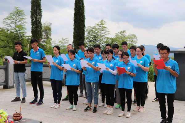 “无论是从强盛走向衰落/还是面对外族入侵/我们的民族始终乘龙之脊梁/战己之所土…”在诵读悲壮激昂的祭文后,全体实践团成员庄严重温入团誓词并合唱团歌。