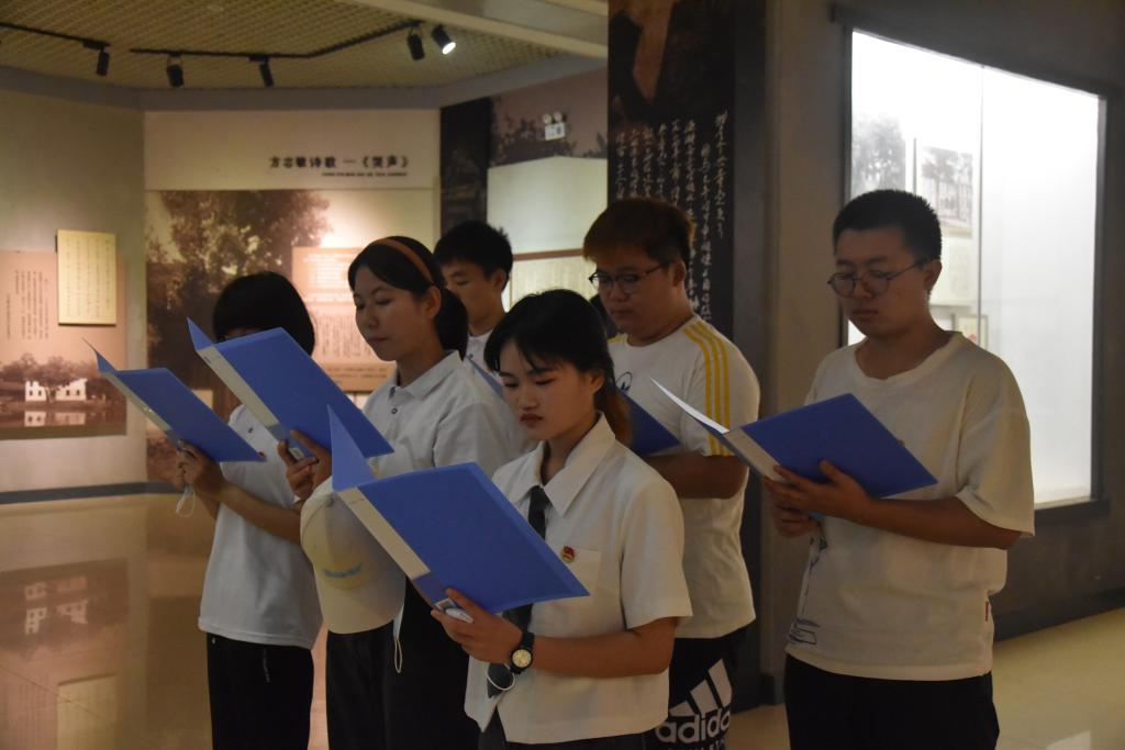方志敏烈士纪念馆内,温和肃穆的光影,精心陈列的展品及真实详尽的介绍,引导同学们了解了方志敏曾经经历过的艰辛坎坷而波澜壮阔的革命岁月。在方志敏诗歌《哭声》展区,团队成员深情朗诵《给方志敏的信》,开启了一场跨越近百年的时空对话。回首,英雄光芒绚丽璀璨;展望,英雄精神百世流芳。