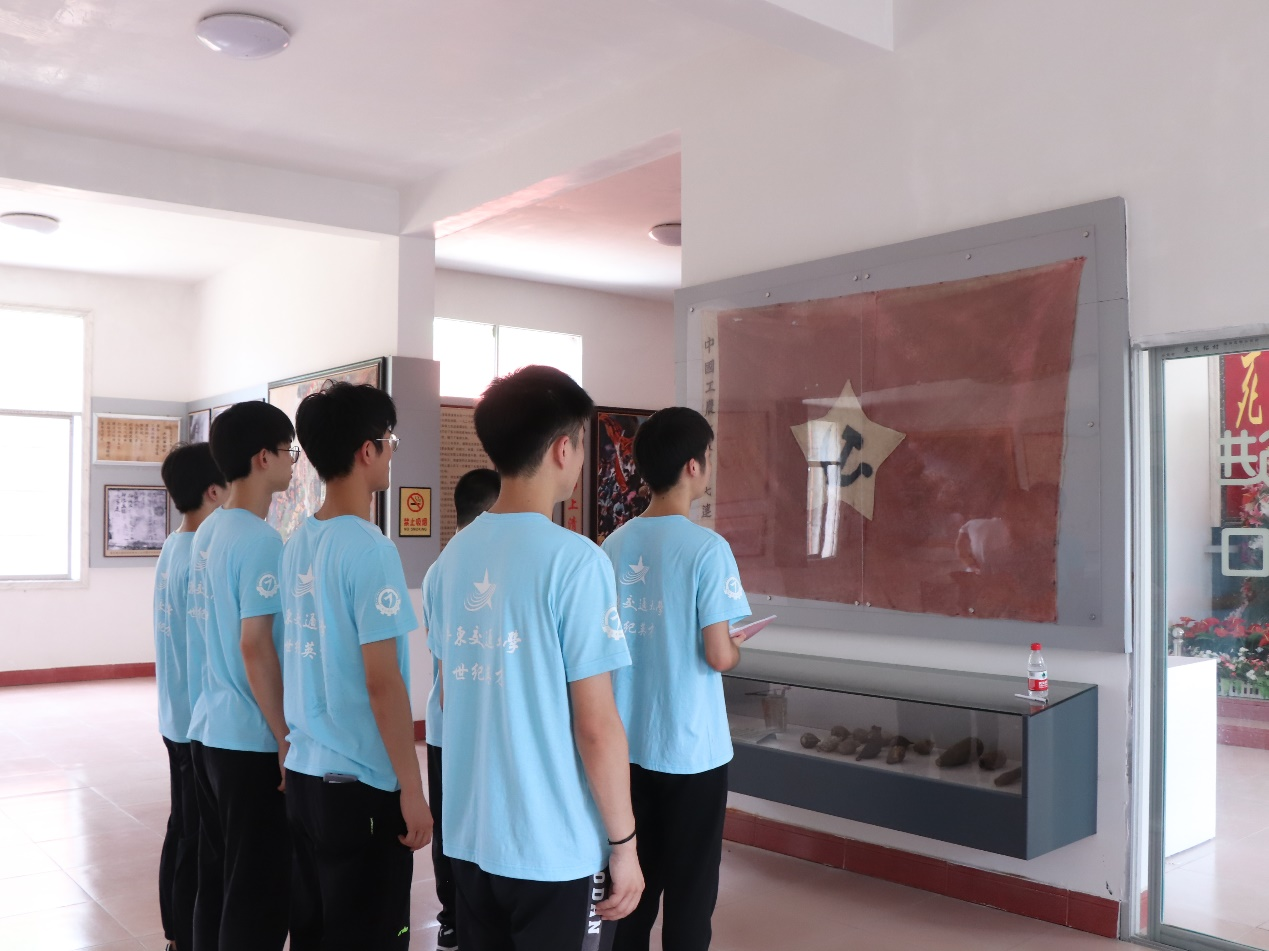 纪念馆内,实践团成员们放慢了脚步,在一件件展品、一幅幅史料前驻足凝望。在党旗展区,实践团成员深情朗诵《党领航作先锋》,过去的峥嵘岁月仿佛就在眼前。