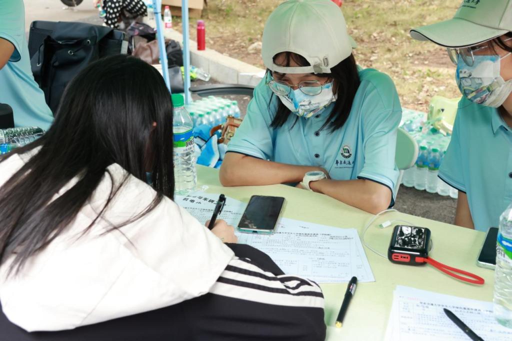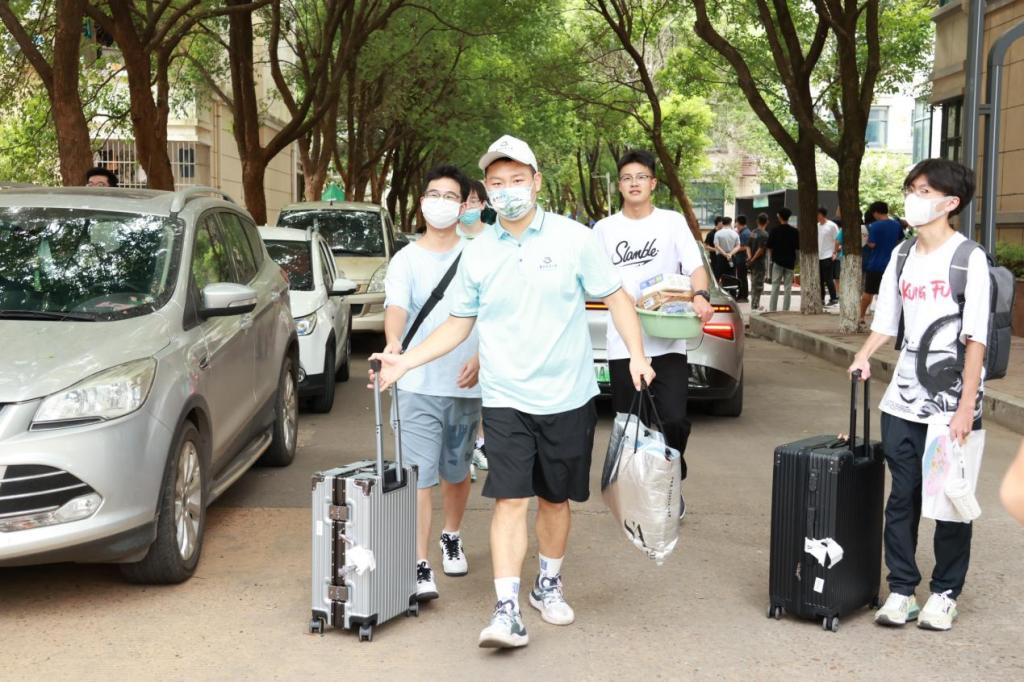 随着大巴车门缓缓打开,22级新生陆续走下大巴。志愿者们热情接过他们手中大包小包的行李,引导其走向所在宿舍的楼栋。