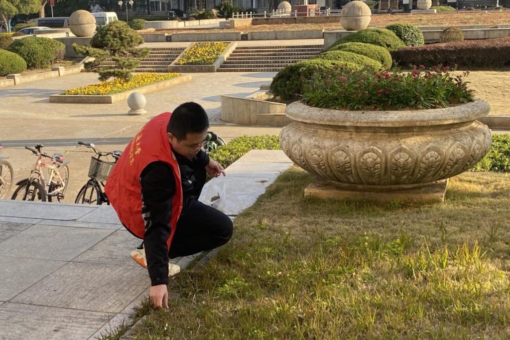 从草坪上不起眼的纸屑到飘落堆积的枯枝败叶,机电大楼门前、南区一食堂外、校园各小路上,处处都有志愿者们低头弯腰的身影,一抹暖心的“志愿红”,也让明媚的春天分外动人。他们以实践赓续雷锋精神,激励着更多学子见贤思齐、择善而同,成为新时代雷锋精神的践行者。