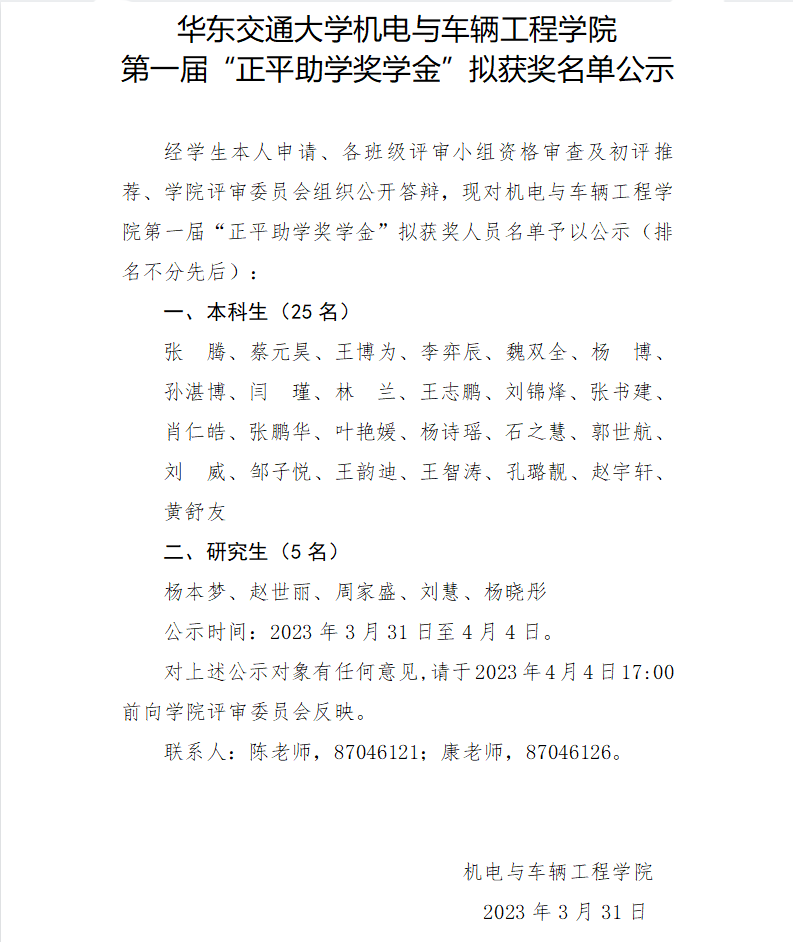 yl23455永利集团第一届“正平助学奖学金”拟获奖名单公示
