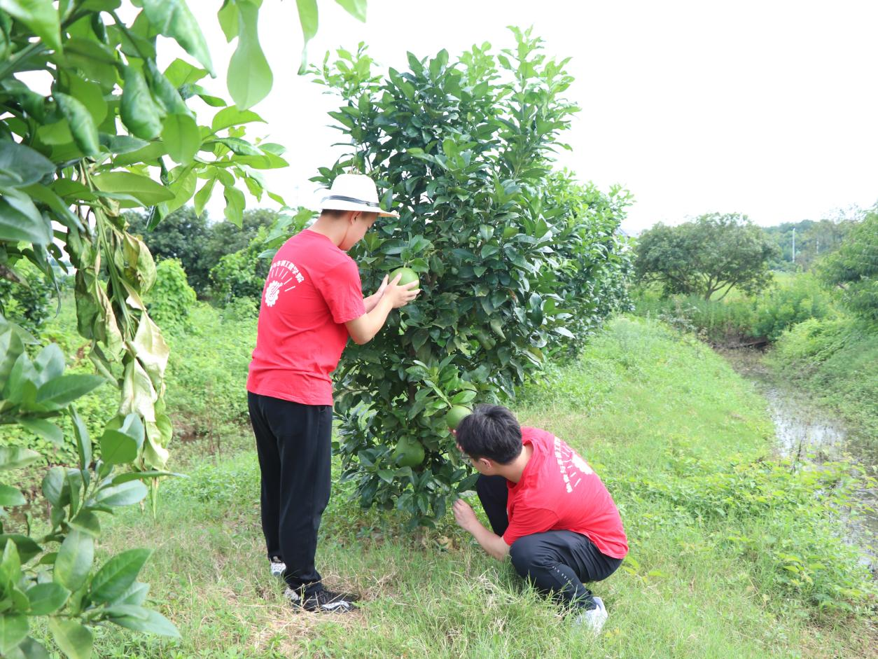 结束除草工作后,实践队伴着夕阳,来到了柚子种植地,对柚子的生长情况进行近距离观察。及时对有虫害情况的柚子树进行标记,使村民能够及时有针地对柚子树进行治理,为柚子的丰收贡献了自己的力量。
