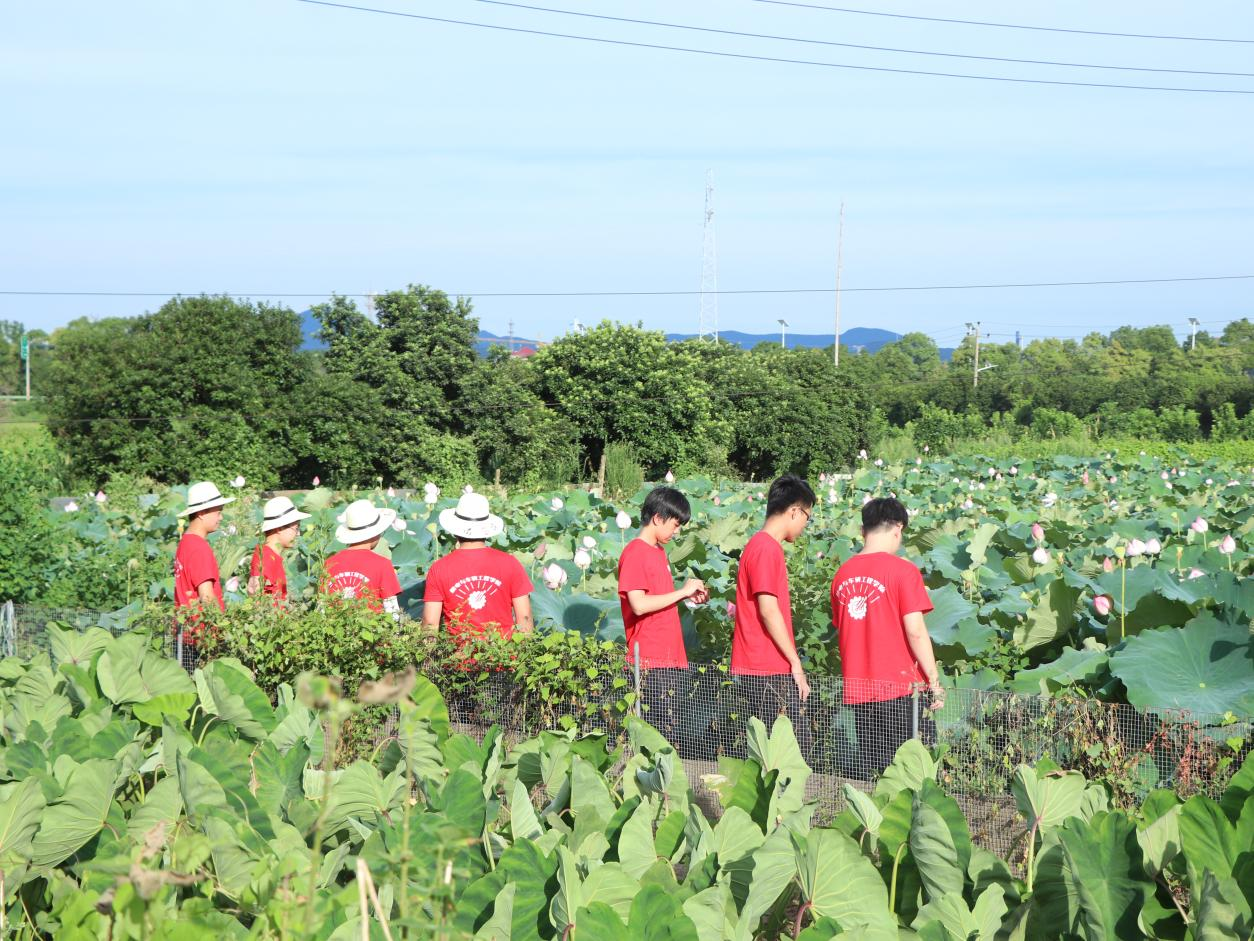 “接天莲叶无穷碧,映日荷花别样红”,实践队首先来到了莲花田中帮助村民采摘莲子,莲叶莲花在烈阳下格外耀眼,绿色莲叶与粉红花朵在似火骄阳下展现着妖娆姿态。