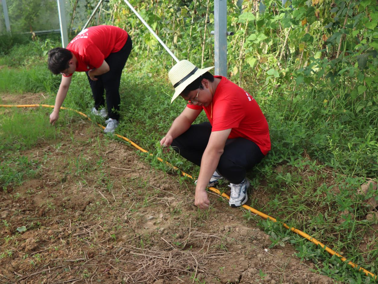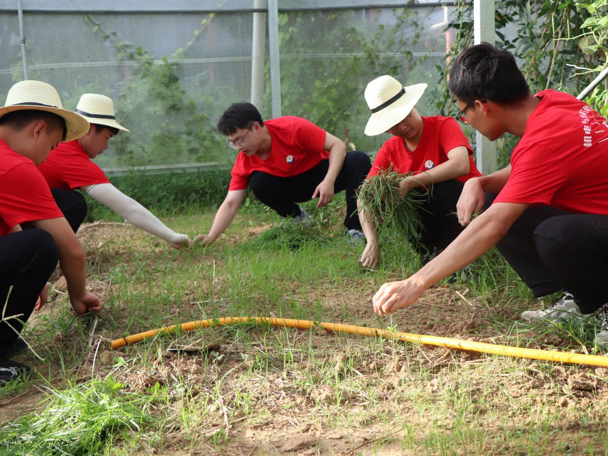 随后,实践队来到大棚中进行除草劳动。此时气温已攀升到最高点,而大棚更为闷热,炽热的空气扑面而来。有实践队队员打起了退堂鼓,但当看到村民伯伯仍在大棚中辛勤耕耘,大家互相打气,开始了下午的劳动。