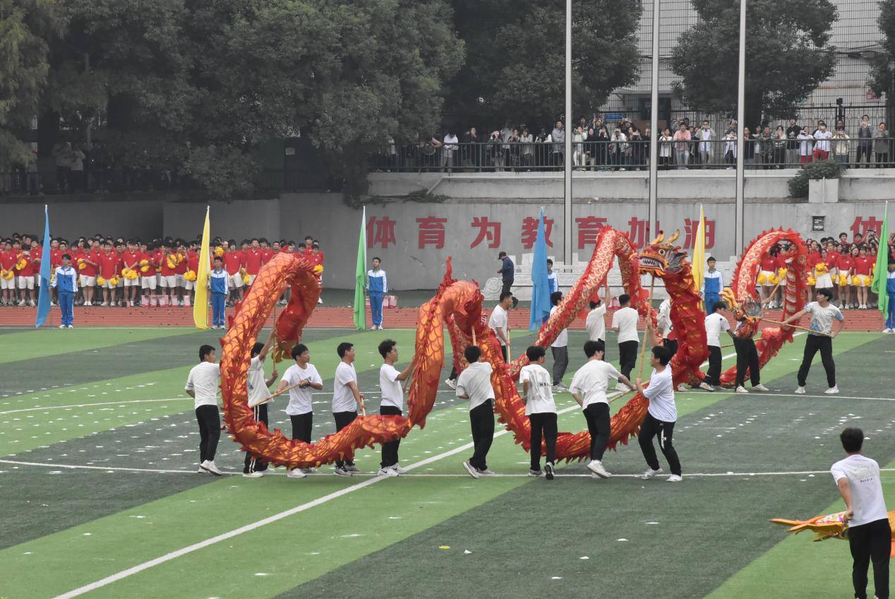 方阵队退场,舞龙队伴随着乐声鼓声奔跑而上。我院的锦瑟长龙在会场上欢腾起舞,穿梭疾行。