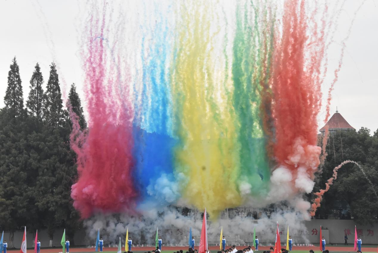 校领导致辞、运动员代表宣誓后,礼炮齐鸣,彩烟升腾,如轻盈帷幕飘悬空中,与彩旗交相映衬。