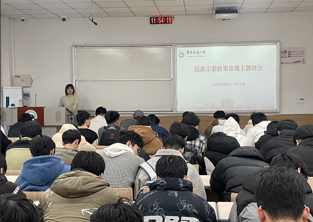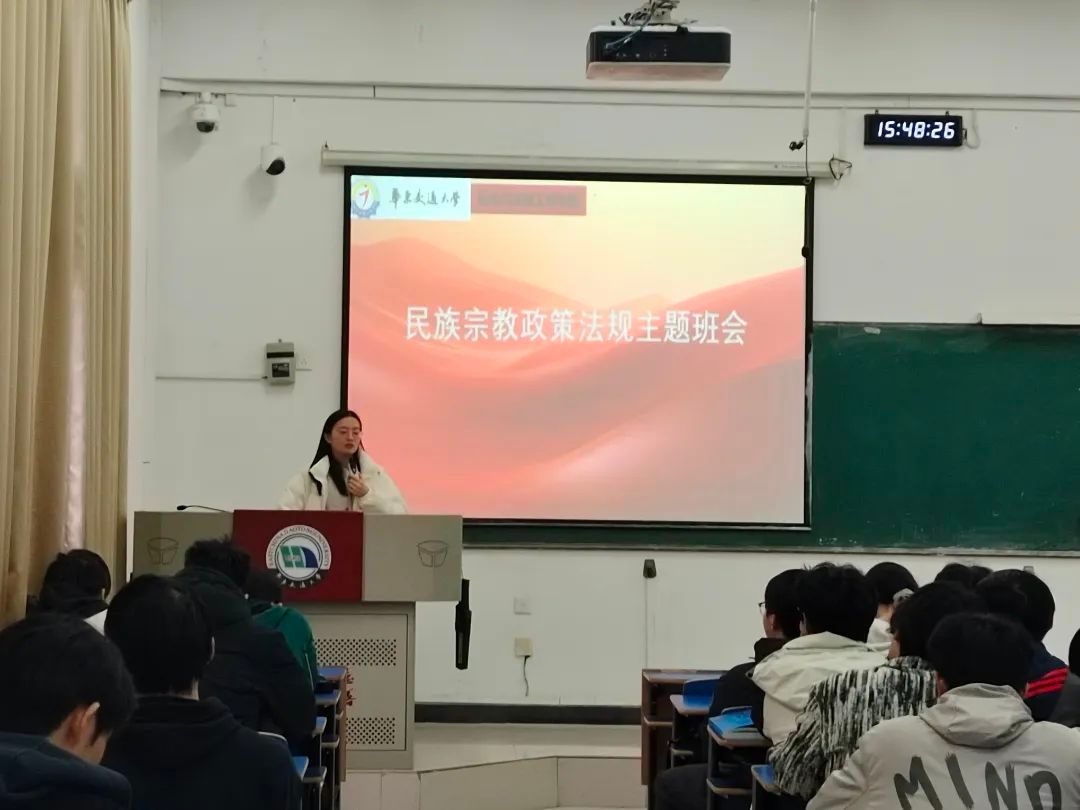 随后,辅导员详细解读了民族宗教政策法规,围绕宗教信仰自由、宗教活动规范、宗教与教育相分离等内容展开讲解,着重强调了“两个不得”(任何人不得利用宗教进行妨碍国家教育制度的活动;任何组织和个人不得在学校进行宗教活动 )和“五个严禁”(严禁在学校传播宗教思想、发展教徒;严禁在学校设立宗教活动场所、举行宗教活动;严禁师生建立宗教团体和组织;严禁师生在校内外参加或组织参加宗教活动;严禁穿戴宗教服饰、佩戴宗教标志 ),引导同学们准确把握政策法规的内涵与要求,提高对非法宗教活动的辨别能力和防范意识。