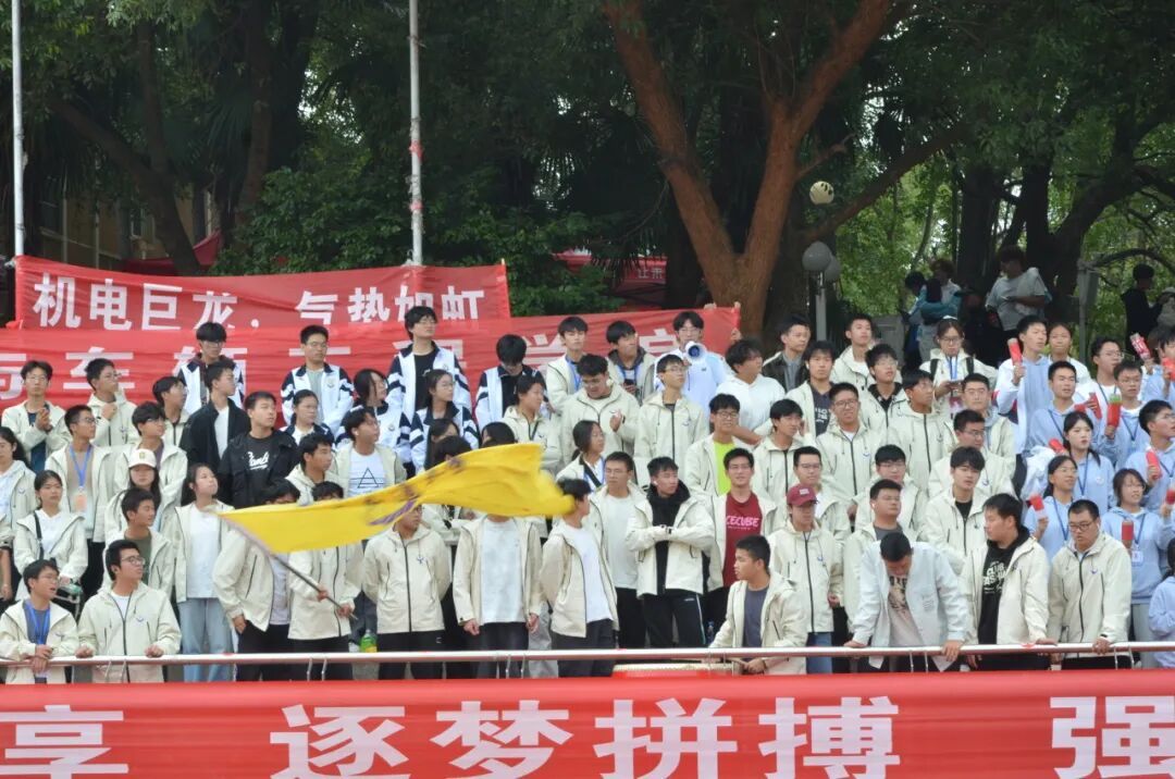 赛场是机电健儿的战场,看台则是热血后援团!拉拉队声声呐喊与挥舞的院旗,为选手注入无穷力量。