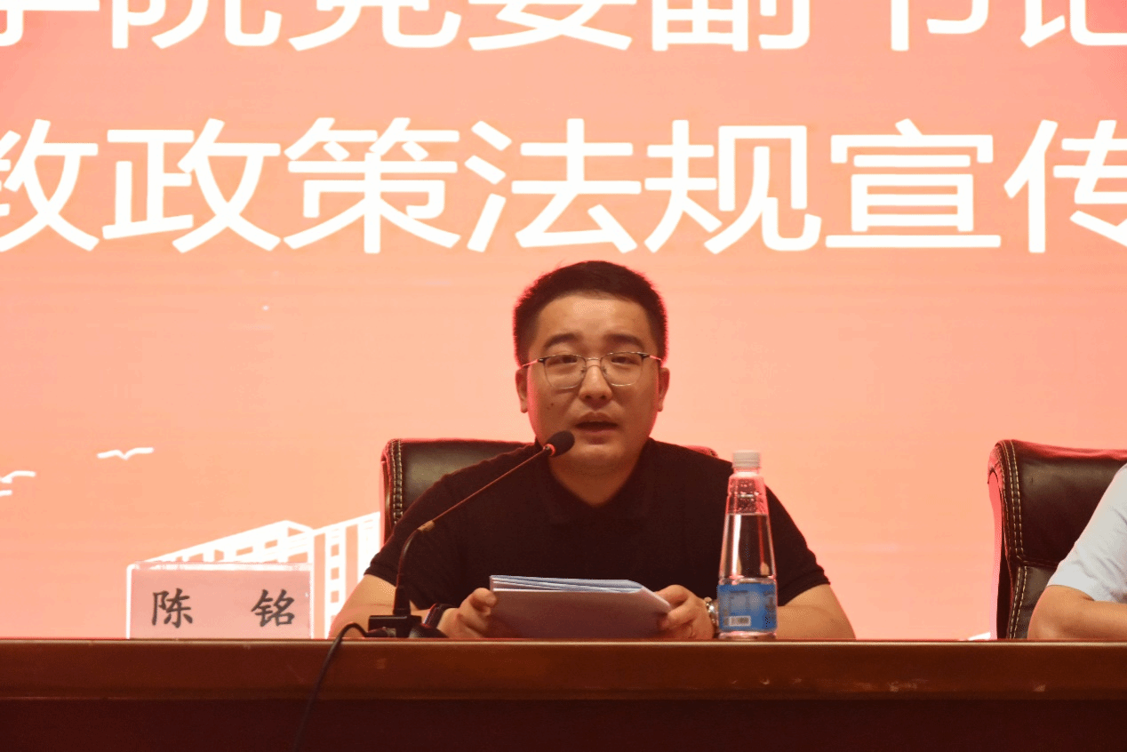 院党委副书记陈铭围绕中国特色社会主义民族宗教理论、民族团结进步的内涵、党的民族宗教政策法规等内容为全体新生开展民族团结进步教育和党的宗教政策法规宣传教育。陈铭指出,各民族团结友爱是中华民族的光荣传统,是社会主义民族关系的生动体现,是中华民族繁荣发展的重要保证,希望同学们树立高远的理想追求和深沉的家国情怀,以铸牢中华民族共同体意识为己任,不断增强“五个认同”,像爱护自己的眼睛一样爱护民族团结,像珍视自己的生命一样珍视民族团结,与各民族同学相互了解、相互尊重、相互包容、相互欣赏、相互学习、相互帮助。结合实际案例,陈铭详细讲解了马克思主义宗教观、党和国家关于宗教工作的基本方针政策等有关内容,重点强调“两个不得”和“五个严禁”要求,鼓励同学们坚定理想信念,树立正确的世界观、人生观、价值观,弘扬爱国主义精神和社会主义核心价值观,传播社会主义先进文化,坚决抵御和防范校园宗教渗透,坚决抵制邪教,真正形成科学的马克思主义宗教观,自觉维护国家政治安全和意识形态安全。最后,陈铭还就大学生医保政策及学平险投保知识为全体新生展开宣讲。