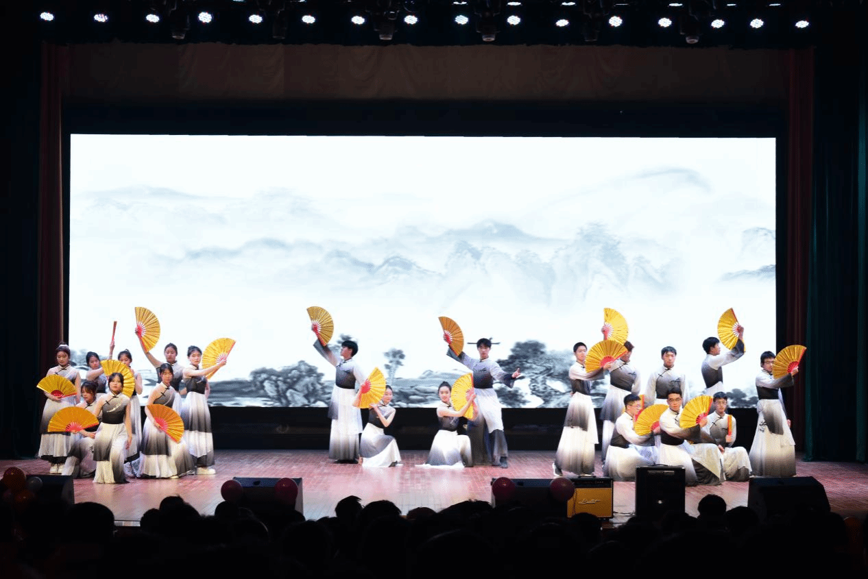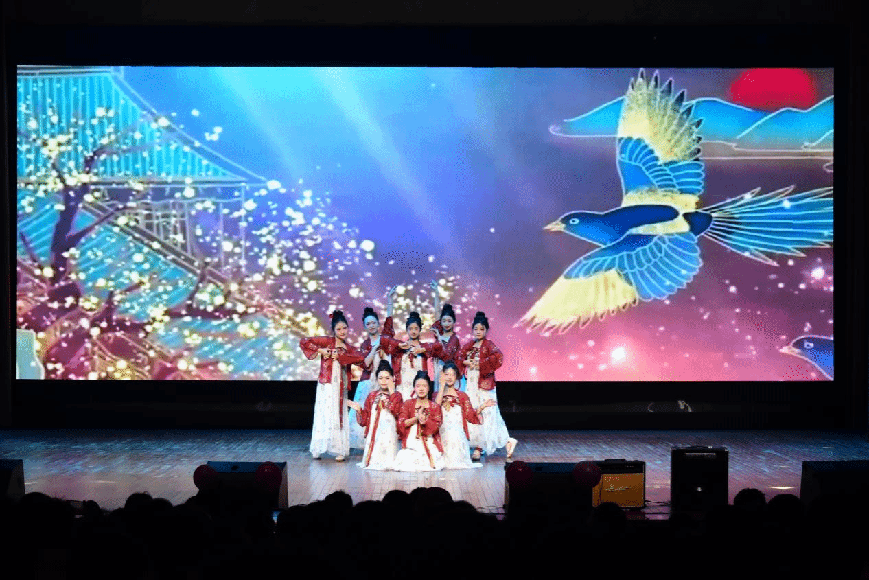 民族舞表演《梦回汉唐》在演出人员的翩翩起舞中开场,舞者们身姿轻盈,似云间穿梭的飞鸟,用灵动的舞步勾勒出汉唐盛世的繁华轮廓。