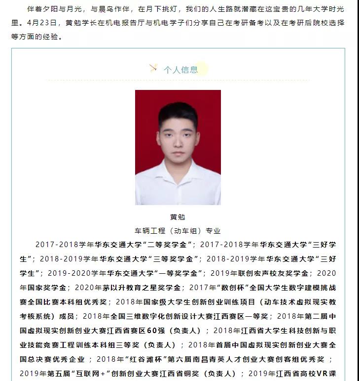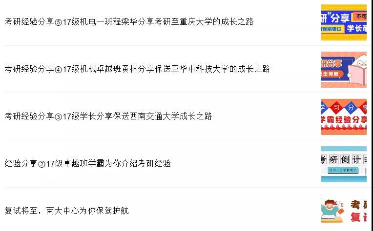 二、优秀考研学生开展考研经验分享。“听君一席话,胜读十年书”,榜样的力量是无穷的,特邀优秀考研学生通过多样形式,如:录制视频、线上或线下等方式,分享他们的考研经验,以激励学生的斗志,助力学生找到适合自己的学习方法。