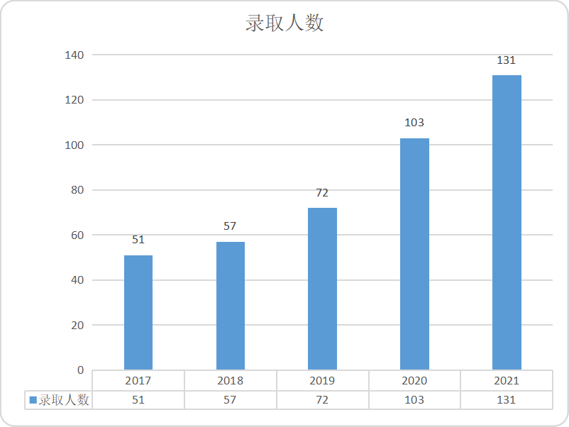 yl23455永利集团研究生录取率逐年提高,形势喜人,录取率在学校名列前茅。机电学院2021年毕业生总人数为506人,考研上线人数140人,上线率为27.67%,考研录取人数高达131人,考研率为25.88%,再创历史新高。从2017年录取人数51人、考研录取率10.65%到2021年录取人数131人、考研录取率25.88%,我院的考研录取人数翻了一番,学生录取院校也有了质的提升,2021年考研同学中有71人录取国家“双一流”高校,占考研录取人数的54.19%,以下是近五年的录取人数和考研率: