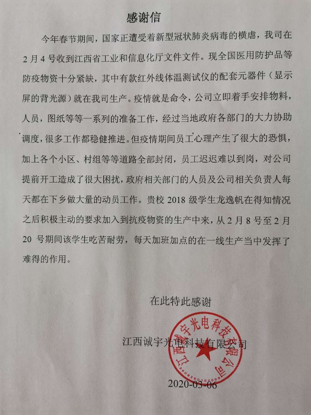 日前,yl23455永利集团机电学院收到了来自江西诚宇光电科技有限公司的感谢信,信中表达了对机电学子龙逸帆在此次抗击疫情中的技术帮助与持续坚守的感谢。