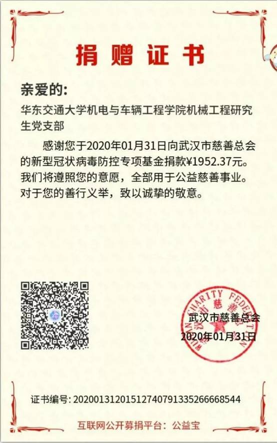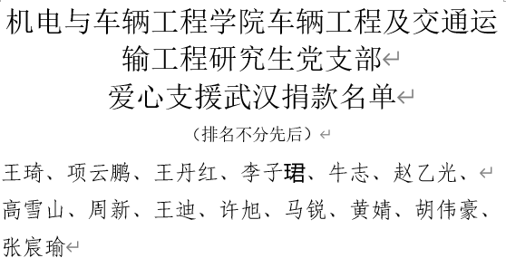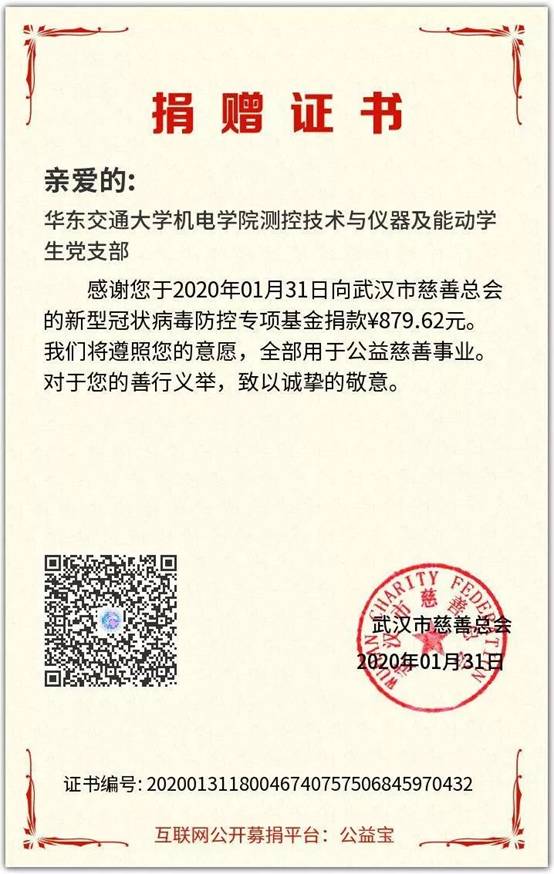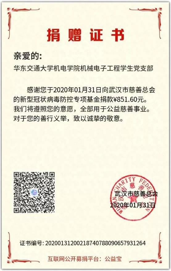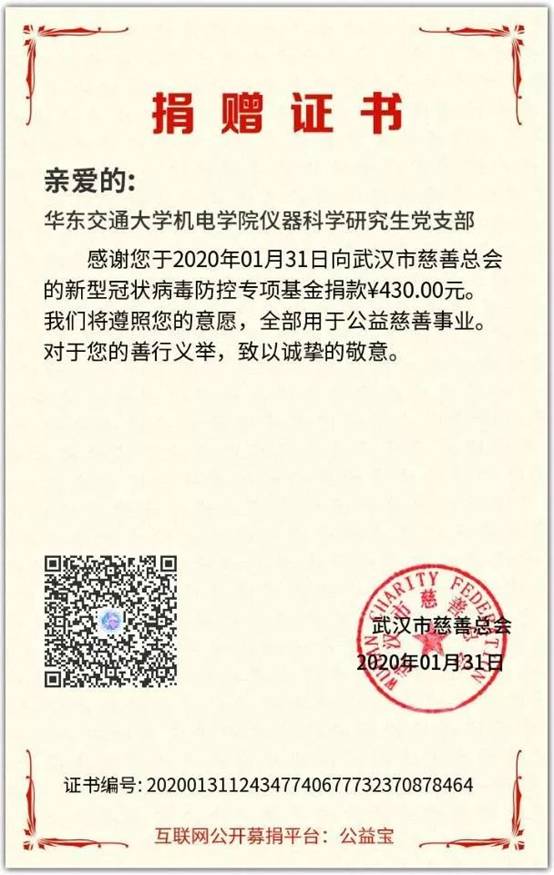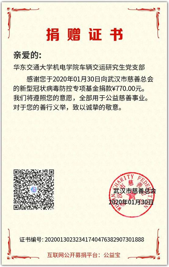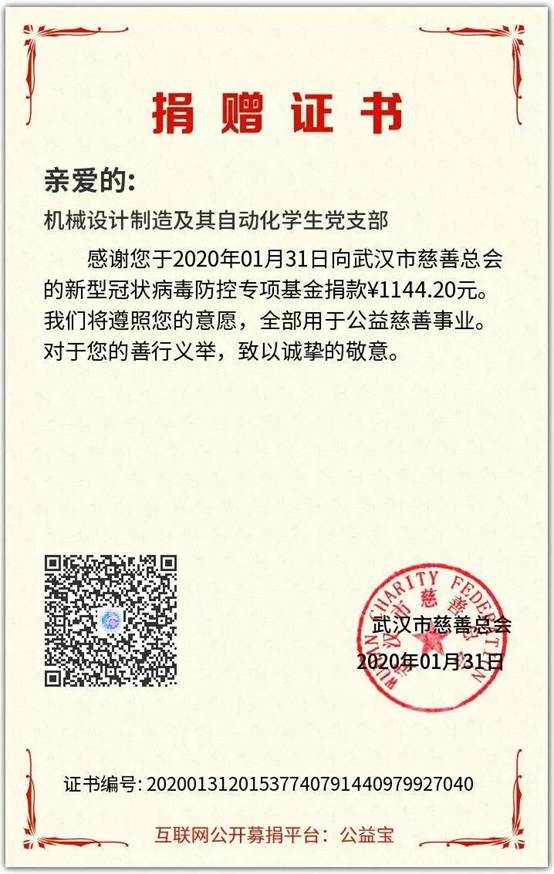 经过统计我院学生党员累计捐款7508.79元,将全部交于武汉慈善总会用于抗疫救灾各项事宜。习近平总书记强调“生命重于泰山。疫情就是命令,防控就是责任,只要坚定信心、同舟共济、科学防治、精准施策,我们就一定能打赢疫情防控阻击战”,相信在党中央的领导下,没有克服不了的病毒,没有战胜不了的困难,这场战“疫”,我们一定能赢!